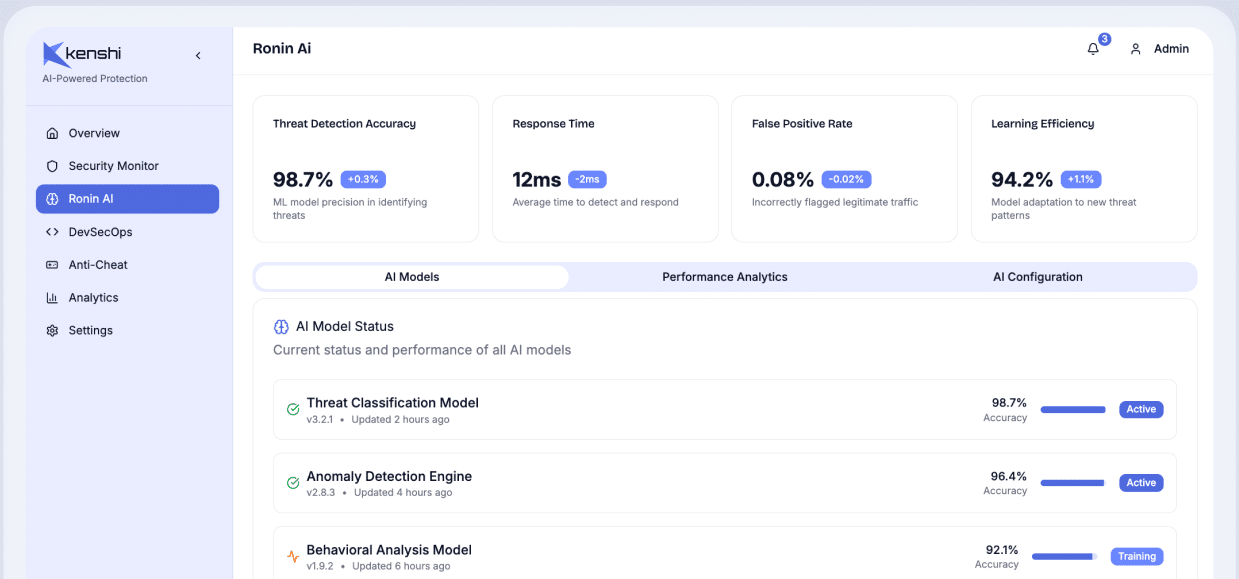 Kenshi is built for digital platforms where performance, protection, and precision must operate together. Our systems adapt in real time, integrate cleanly with your architecture, and respond to threats with clarity and control.